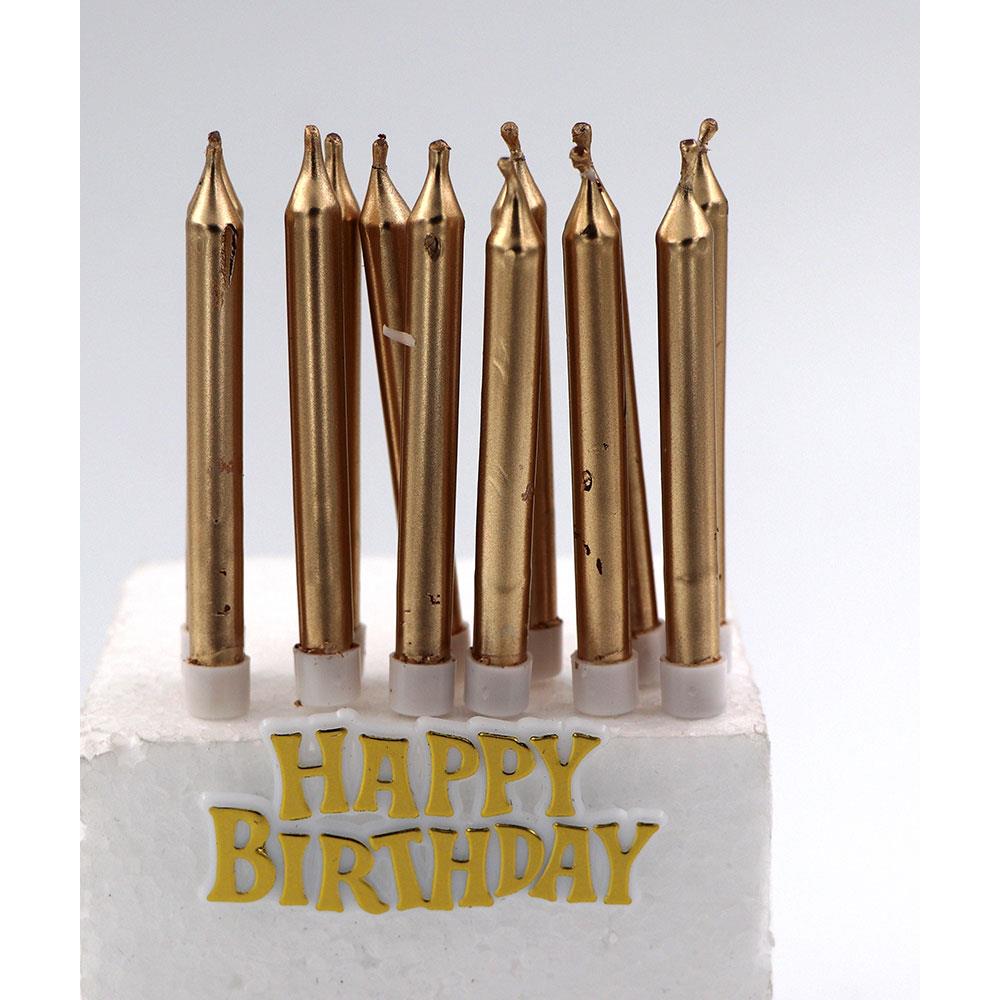 נרות ג'מבו בצבע זהב מבריק, 12 יחדות, מצורף למארז קישוט פלסטיק לעוגה בצבע זהב עם הכיתוב HAPPY BIRTHDAY.